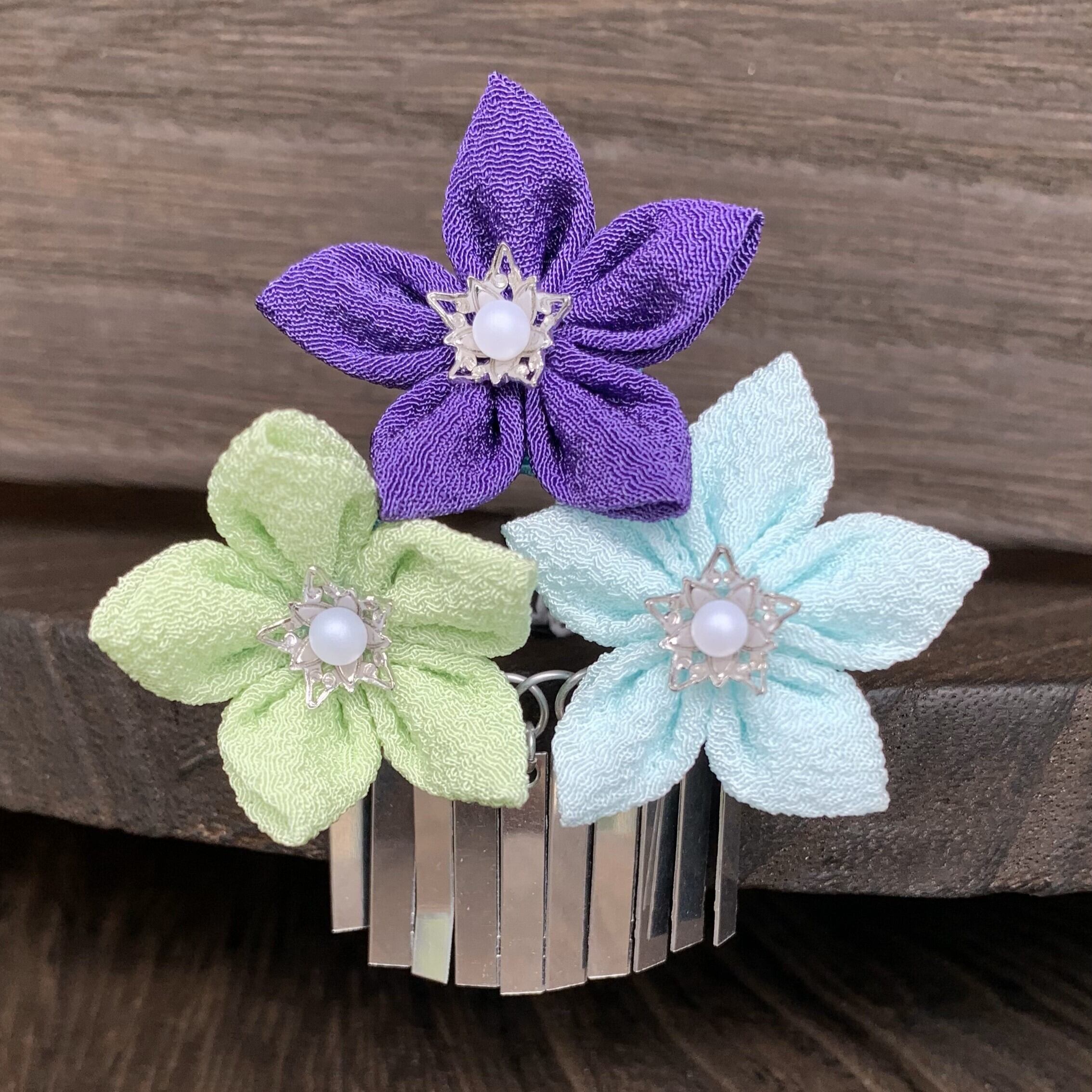 ビラかん付きのスリーピンに、星形の小花が可愛らしく飾られています。すみれ色と若芽色、水色の組み合わせは、爽やかで清楚な感じを演出してくれます。同じシリーズの藤さがり付きの商品と合わせれば、一層素敵なアクセサリーセットが完成します。